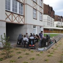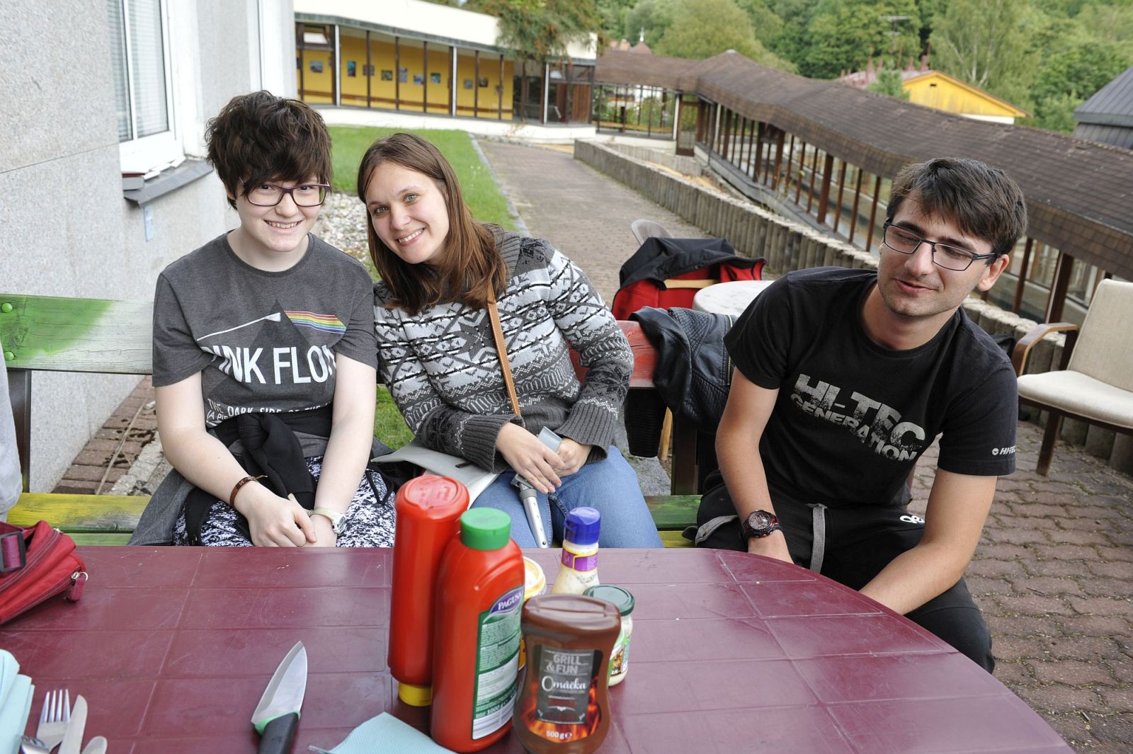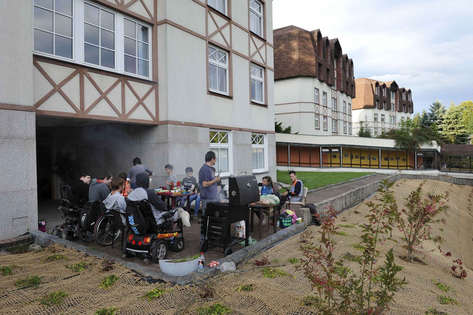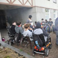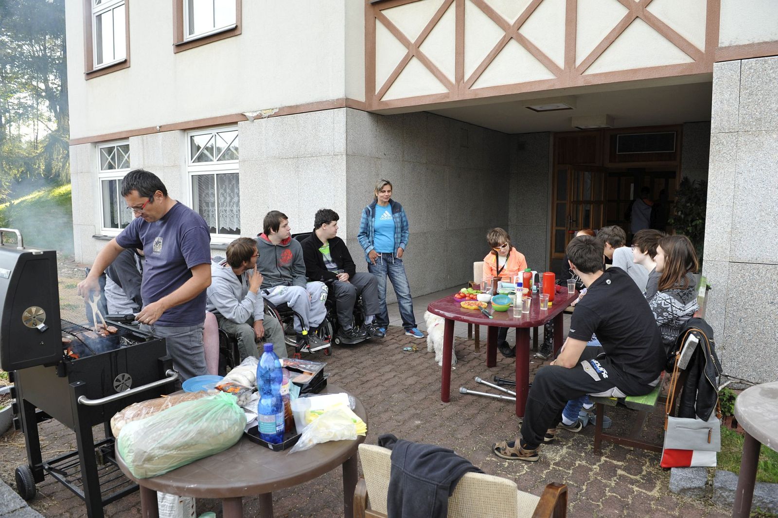 Podvečerní grilování před budovou internátu v rámci adaptačního kurzu prvních ročníků